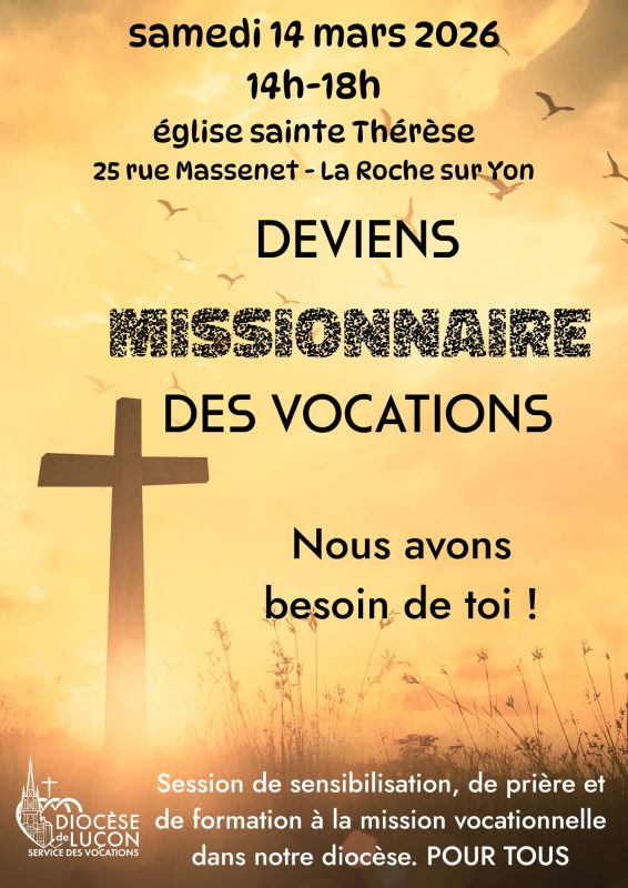 Le service des vocations propose un temps de prière diocésain, de sensibilisation et de formation à la mission vocationnelle. Il sera animé par le père Gonzague Delahaye, le samedi 14 mars 2026, de 14h à 18h, à l’église Ste Thérèse (La Roche sur Yon).